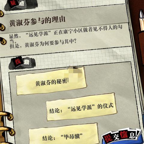 如上图所示,黄淑芬参与的理由问题中需要提交的线索有“黄淑芬得到秘密”、“结论:远见学派的仪式”以及“结论:毕昂骥”这三条线索内容,玩家可以根据以上的线索指向寻找思路进行线索收集。希望可以帮助各位小伙伴找到收集线索的思路。