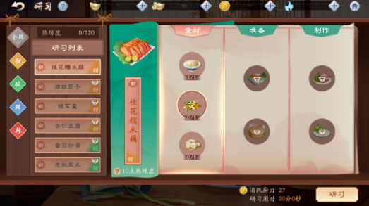在这里,可以解锁多达数十种菜谱。每完成一道菜的研习都可以不同程度的提升气血、命中、闪避、防御、攻击属性,同时获得“熟练度”。