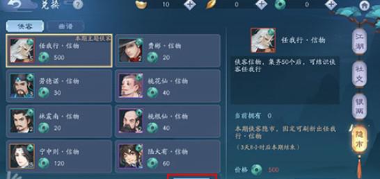 在隐市里面,玩家可以使用这个同心佩,然后兑换侠客的信物,大概兑换500个同心佩,就可以顺利的触发这个剑客奇遇。