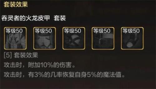 同时,若玩家将上述五件装备全部获取并完成配置,那么则能带来套装属性。基础的,攻击阶段可以附加额外的10%输出量。并且,还有一定的机会回复个体的百分比魔法值,提供更好的持续作战打击效果,带来更好的输出收益,是一件完全不可忽视和替代的套装。