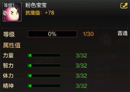 2、属性上,玩家在装备粉色宝宝后可以收获力量、精神、体力以及智力,分别是3点,后续可将之培养至32点。而我们知道,这些属性全部是四维属性,属于职业不可或缺的,也是必须囤积的。因此,虽然整体的加成数量不高,但依旧值得小伙伴们前中期拥有和配置;