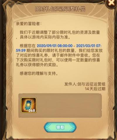 官方会根据玩家在2020年9月10日至2021年3月1日购买的限时礼包数量,从而发放对应的惊喜礼券。玩家可在邮件中领取获得。