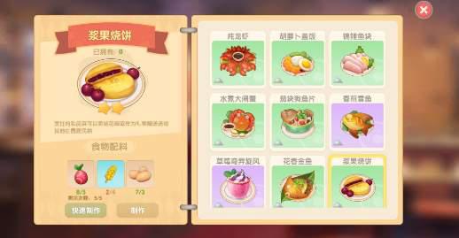 浆果烧饼是一个2星的料理,玩家厨师达到一定等级后就可以解锁和制作了,配方为3红色浆果+4小麦+4鸡蛋。前提玩家必须先达到对应的厨师等级,否则即便按照配方烹饪也会失败哦。