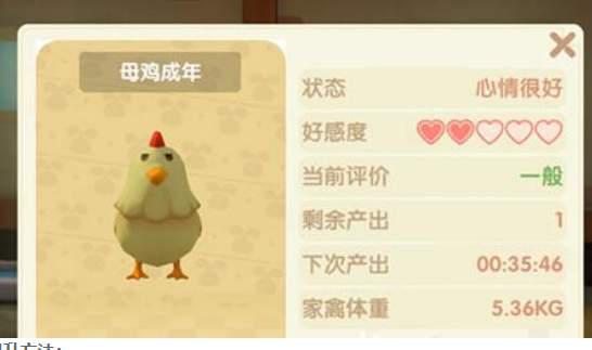 3、以鸡为例,购买幼崽的初始好感度是2心。每个晚上刷一遍毛,直到5星好感为止。