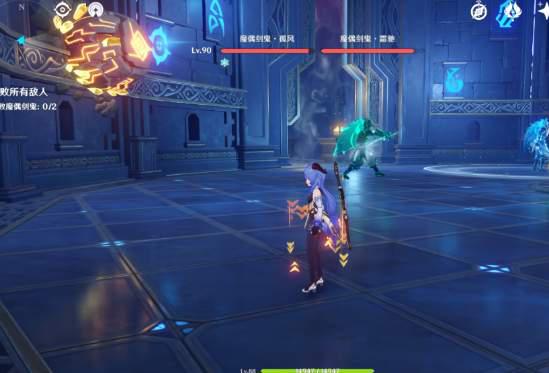 3、怎么逃课:在剑鬼那一半场的第二根和第一根附近的位置放荒星,然后切温迪原地放一个风场,到这里之后冰剑鬼就会发呆,风剑鬼二段砍和n段砍循环,这时候就可以直接跳下来,这里是用温迪加大逃课力度,无脑躲剑气,躲完之后就可以远程角色磨一下血量。
