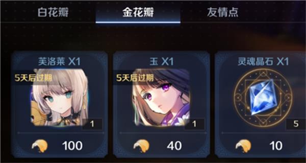 1、金花瓣是一种作用和价值很高的道具,是小伙伴们在商店兑换角色魂石的重要物品,需要玩家尽可能的收集和拥有;