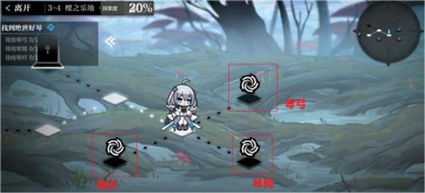 3-4关卡的完成,需要小伙伴们找到绝世好琴,其中包含有琴弓、琴筒、琴杆,具体如下: