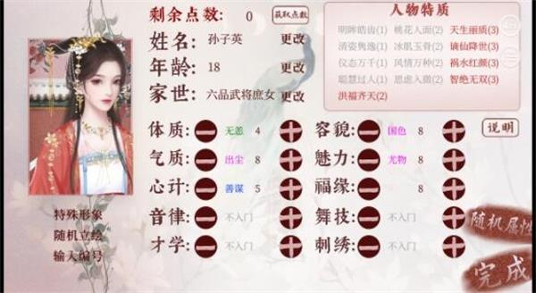 注:家世为8~9品文官/武将的庶女/义女,可用点数有可能达到21或22,如何选择凭个人喜好。