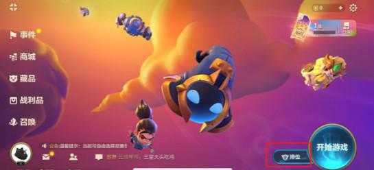2、在游戏的主界面上,我们进入游戏后,会自动选择时空裂痕的版本,如果想要玩英雄之黎明版本,先点击开始游戏旁边的排位;
