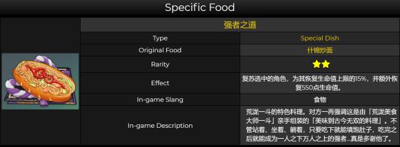 1、荒泷一斗特殊料理名为强者之道(什锦炒面),制作配方是面粉*3+卷心菜*2+兽肉*1;