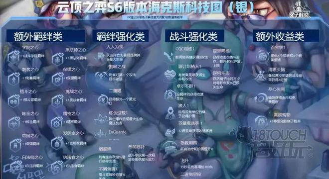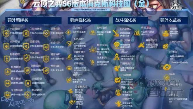 海克斯强化分为金、银、彩色不同肝的品级,具体的效果也各有不同。海克斯强化可以分为额外羁绊、羁绊强化、战斗强化以及额外收益四大类型。