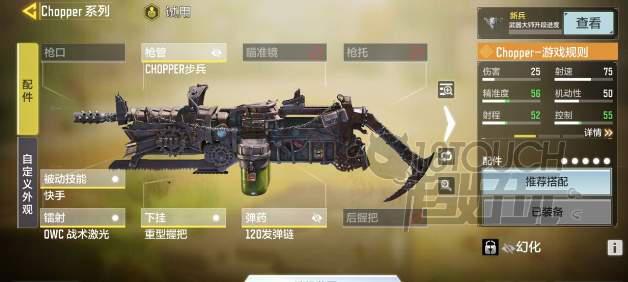 2、此外还配置了CHOPPER步兵、OWC 战术激光、被动技能快手,射程、举镜移速都进一步提升,同时举镜射击散布降低,换弹速度也更快;