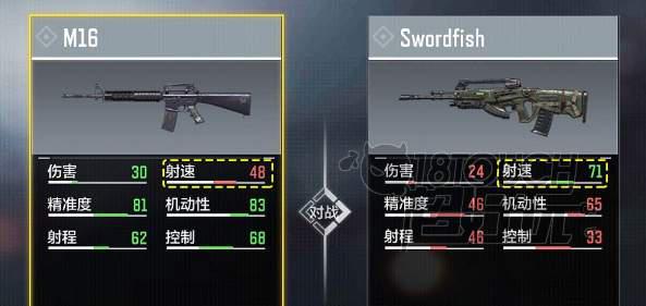 swordfish在面板属性上来看,除了射速比较优秀之外,其他几类属性均低于特殊开火模式的M16。
