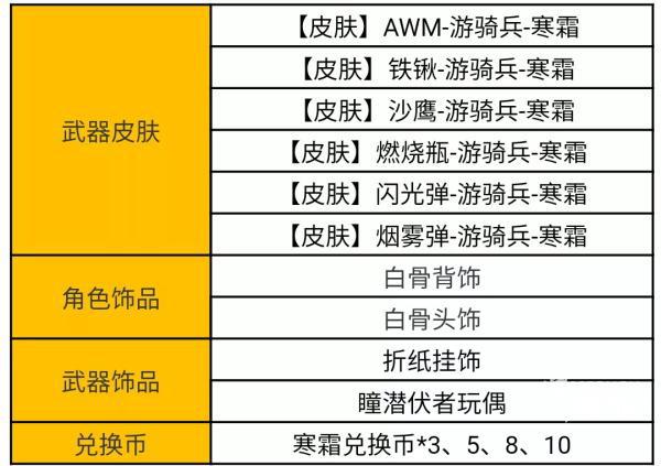 游骑兵寒霜夺宝的奖池内容极为丰富,主要奖励是AWM-游骑兵大套装的寒霜皮肤。当然,大家期待已久的白骨背饰、白骨头饰也会出现在奖池中。除此之外,奖池中还有瞳潜伏者玩偶、折纸挂饰以及3-10个寒霜兑换币。下图是游骑兵寒霜夺宝的奖池详单,请大家自行参考。
