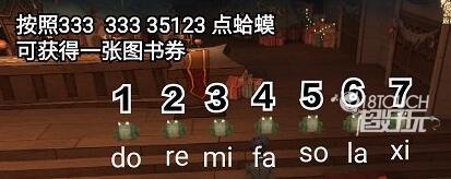 2,我们在来到蛤蟆前面,按照发出的声音“333 333 35123”的音调节奏点击蛤蟆,对应文字就是“叮叮当,叮叮当,铃儿响叮当”,我们成功点完后,就可以获得一张图书券;