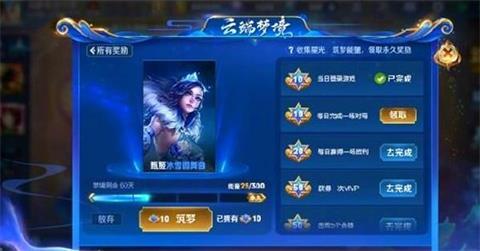 而玩家想要获得这些皮肤或英雄奖励,则需要使用星光筑梦,即玩家开启梦境后需参与每日任务,比如通过参与对局、取胜和获得MVP可领取10-50点不等的星光,同时消耗星光可以为梦境充能,基本上是消耗10点星光获得10点充能,同时也有小概率出现能量暴击翻倍的情况,而只要将能量条充满便能领取相应的永久奖励!