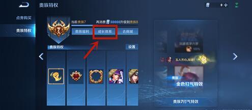 2、再点击右下角【贵族特权】按钮,在贵族特权的界面中选择成长体系。