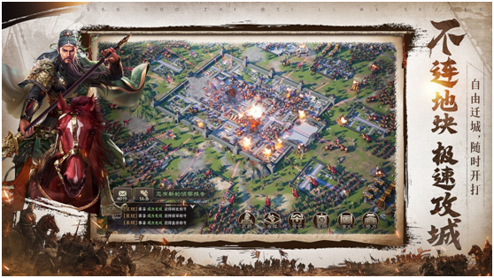 不仅如此,《三国志威力无双》还极力营造三国战场的真实沉浸氛围,在了解到单纯的数值变化难以让玩家有完整三国沉浸体验后,《三国志威力无双》一改传统SLG游戏中的“地块”设定,允许玩家自由迁城。游戏内没有一个个分裂的地块,只有一整片可供掠夺的土地资源,玩家可以按照策略布局随时开展极速攻城战,突袭敌军,切身体验三国战场的即时性和刺激感觉。