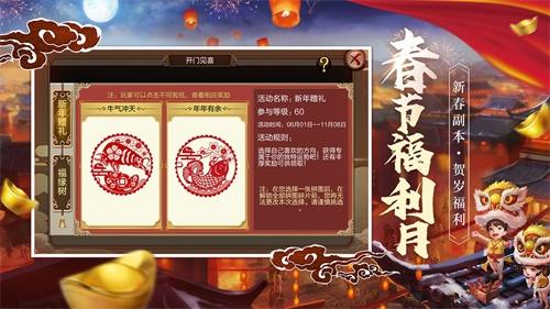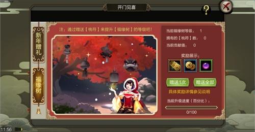 开门见喜包含“新年赠礼”和“福缘树”两个活动,玩家通过完成日常活动获得拼图碎片,集齐所有的拼图碎片可获得超值奖励。玩家通过拼图任务可以额外获得【桃符】用来升级【大树】,将大树升至指定级数可获得全服奖励。