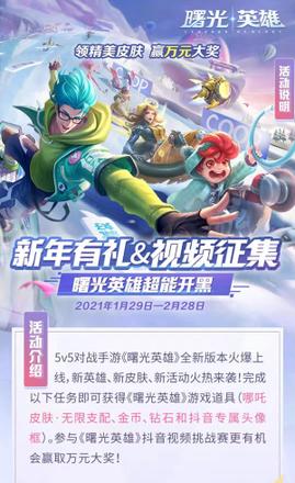 《曙光英雄》在抖音APP开启新年有礼&视频征集活动。现在,你登陆抖音,搜索#曙光英雄话题,进入话题即可参与视频征集活动。玩家在活动页面上传曙光英雄内容的短视频,赢取活动积分,可以免费兑换哪吒新皮肤——无限支配,以及海量钻石、金币等道具奖励。