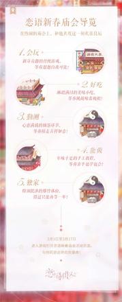 活动期间还将推出恋语新春庙会,完成每日登陆、活跃与分享等任务,即可领取【游园币】,使用【游园币】,可以和他一起参与各色庙会活动,完成活动可以收获【摊位道具】一份。累计摊位道具达指定数量,可打开【新春庙会同游礼盒】,随机领取限时星河券、钻石*100等多重奖励中的一种。累计参与25次庙会活动,即可加入特别奖励抽选名单,赢取实物大奖。与他同游这场欢庆盛典,过一个热闹新年吧。