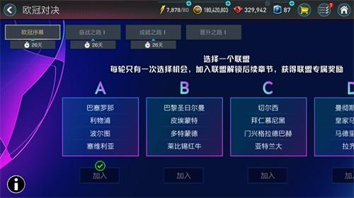 在这个章节中,玩家可以从A、B、C、D四个联盟中选择一个联盟加入,而欧冠每轮将只有一个选择机会,加入联盟后将解锁后续章节并获得联盟专属奖励。