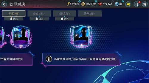 当球队晋级时,欧冠对决活动中该队球员的能力值将自动提升;而当球队夺冠时,该队球员可升至游戏内最高能力值!
