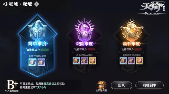 在首期秘境副本中,冒险家将挑战灵墟·弑神,并根据自己的战力选择不同的难度。战力越高的玩家,获得的奖励也越多。即使是萌新冒险家也不必担心,随着战力提升,可以进行反复挑战,制定属于你自己的挑战目标,朝着那个目标奋勇前进,获得更好的奖励吧!