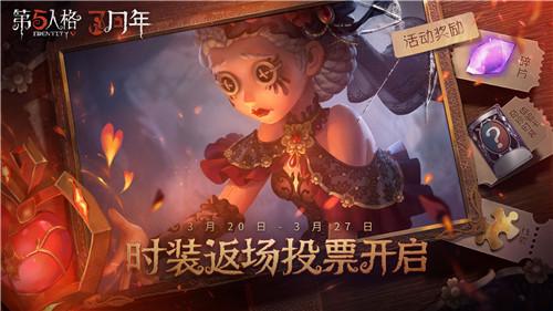 人气时装集结亮相,谁能返场由你决定!网易首款1V4非对称竞技手游《第五人格》三周年庆典即将开始,在这全员共庆的狂欢时刻,怎能缺少出席盛典的华服?今日,《第五人格》时装返场投票活动已经开启,助力你心仪的时装限时返场,闪耀庄园!