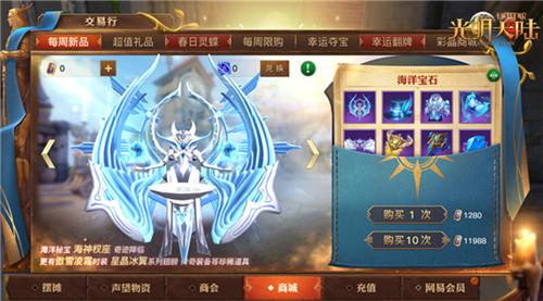 每周新品上架“海洋宝石”,使用“海洋宝石”将有几率获得“海神权座”坐骑等珍稀外观道具。