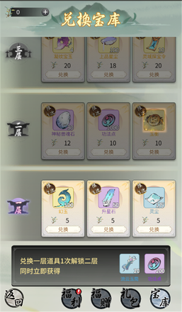 仙友们在签到、礼包等活动得到的柳枝,可在宝库中兑换各种游戏道具。兽魂石、功法点、玉衡、凝纹宝玉、上品星尘、探宝令等稀有道具均可在宝库中兑换。宝库分为多层,解锁的层数越高奖励越好哦!