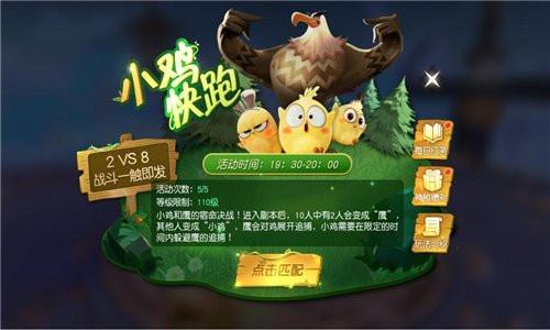 “小鸡快跑”是本次更新推出的全新限时活动,这是一个双方战力的对战类型玩法,2个人扮演鹰,剩余8个人扮演鸡,两方对战角逐胜负。鹰在限时间内吃掉所有的鸡获胜,反之鸡获得胜利,或者鸡击败鹰也能提前获胜。