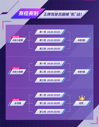 据悉,本届赛事将于4月23日—25日每晚18:00上演,赛程为期3天,参赛队伍被随机分为A、B两组,分别于4月23、24日进行小组赛。每组经过3轮激烈角逐,将产生各自的8强队伍,组成最终16强,在4月25日向总决赛发起最终冲击!