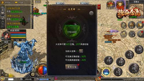 等级提升:前期跟着主线任务进行提升,做完主线任务后可以使用火龙珠来继续提升等级,有火龙珠时打怪人物和英雄可获得额外20倍经验,使用双倍修炼卷轴,人物和英雄均可获得额外40倍经验,推荐地图有土城-除魔之地和野外打宝地图;没有火龙珠时打怪可获得多倍经验储存火龙珠界面,储存经验可以在火龙珠界面中直接提取出来快速升级,每消耗1点火龙珠可获得50万人物经验和25万英雄经验,推荐使用英雄双倍经验,这样英雄也可以获得人物同样的经验,英雄升级不落后。火龙珠获取途径有3种,除魔任务奖励大量火龙珠;完成日常统领挑战也会奖励火龙珠;统领怪物和BOSS怪物也有几率掉落。