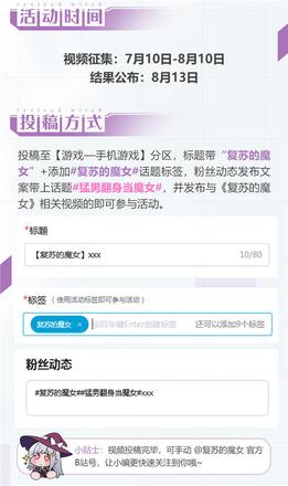 投稿方式:在Bilibili【游戏-手机游戏】分区,标题带“复苏的魔女”并添加#复苏的魔女#话题标签,各位魔女大人只需要发布文案带上话题#猛男翻身变魔女#,并发布与《复苏的魔女》相关视频即可参与活动。