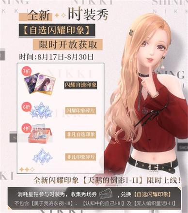 此次游戏更新后至8月30日,全新COLOURS时装秀活动开启,自选闪耀印象限时开放获取。玩家参加时装秀,收集秀场券,换取7折“自选闪耀印象”、6折“闪耀印象碎片”、4折“自选非凡印象”、“非凡印象碎片”和冰凝之心等道具。本期新增性感闪耀印象“天鹅的倒影I-II”。