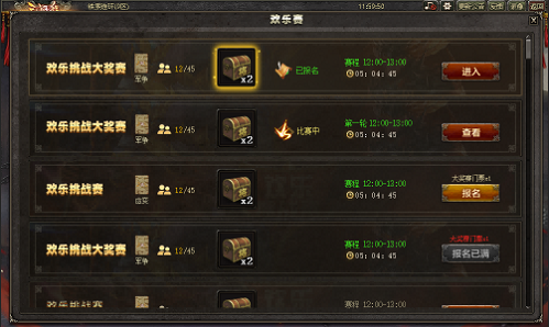 欢乐挑战赛每天固定时间开放,每小时一场,玩家需要留意开放时间。该模式为16人局,玩家需要使用一张挑战赛门票才可报名,而挑战赛门票可以通过元宝或银两购买。