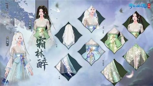 丹枫衣橙白色调,明艳可人,令人眼前一亮;幻枫衣以白色为主色调,辅以玫红、淡粉色加以点缀,充满梦幻色彩;青枫衣选用青色、白色,上身效果就如青春少艾的女子般天真活泼;枫露衣为蓝白色,蔚蓝苍穹白云悠悠,气质高雅如云巅仙子;枫影衣白色上衣搭配墨色长裙,腰间裙摆有黄色枫叶点缀,显得简单而高贵。玩家身着不同的【霜林醉】将产生不同的效果,可谓氛围感十足。