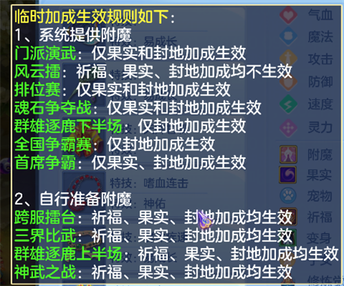 在各种各样的对战活动中,许多状态生效情况也是不一样的,这时少侠可以点击右上角人物头像下方的战备,在战备中点击状态生效规则,即可查看生效情况。此外,少侠也可以在战备界面中查看到自身的装备、属性、附魔、果实、修炼、祈福、子女等是否完备,战前可以再多看一下,避免影响对战。