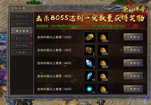 金秋盛典有非常多的活动值得参加,其中最引人注目的莫过于猎杀首领活动了,《原始传奇》玩家每天都会击杀BOSS,而在金秋盛典活动期间,击杀80级以上首领达到一定次数就可以额外获得奖励,让玩家更有动力去挑战BOSS!击杀80个80级以上的BOSS就可以获得生肖礼盒,传说打开礼盒可以获得传说中的力量,大大提升玩家战力!