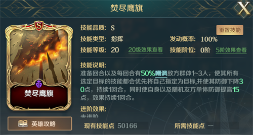 焚尽鹰旗:准备回合以及每回合有50%嘲讽敌方群体1~3人,使其所有选定目标的技能都会优先将自己指定为目标,并使其防御下降30点,持续回合,同时使自身以及随机友方单体防御提高15点,效果持续1回合。