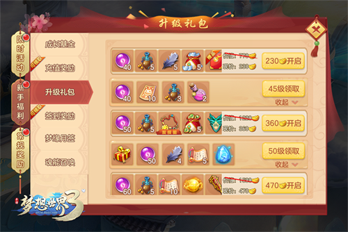 玩家从20级开始,每提升一定的等级都可以领取对应的升级礼包,不仅有任务装备、还童丹、宝石包等常规道具,还有悬赏令、天兵令、强力兽诀等珍稀道具!