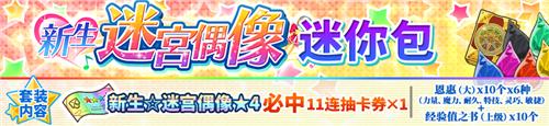 礼包内容:新生☆迷宫偶像★4必中11连抽卡券*1、恩惠(大)*10个*6种(力量、魔力、耐久、特技、灵巧、敏捷)、经验值之书(上级)*10个。