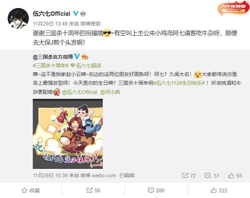 最关键的一点是,《三国杀》官方在11月29日,伍六七生日当天,发布过生日贺图,并与伍六七官方亲切互动了一波,似乎可以看成是双方合作的信号。