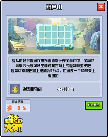 在葫芦山地图战斗时,普通攻击的伤害值会累积在宝葫芦中,宝葫芦装满后,玩家可以主动对我方场上的怪物喷射火柱。宝葫芦起始可累积上限值为五万点的伤害,玩家每通过一个BOSS关卡,宝葫芦的上限就会随之增加。