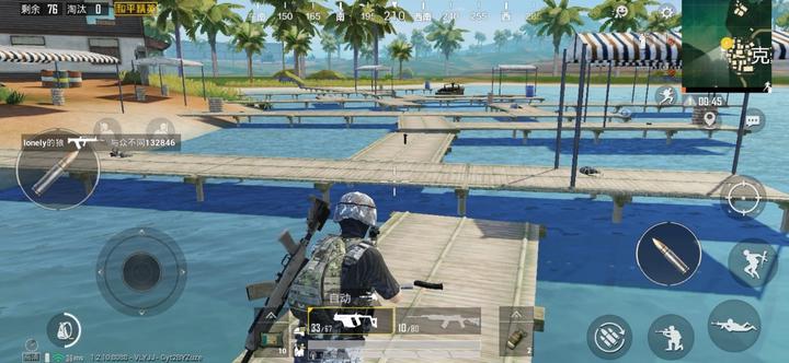 可以看到,由于海边的水并不深,玩家在被敌人开枪击中后只需要跳入水中,木台就能成为玩家的掩体,敌人的子弹很难威胁到玩家,处于水中的玩家也能架枪戒备以及吃药回健康值。在看到敌人后可以稍微转移位置,接着只需要按跳跃键爬上木台就能重新恢复敏捷的身手进行反打。