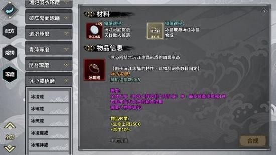 3、在汉家江湖中,冰系列戒指的一阶为冰晶戒,二阶为冰心戒,在熔铸,即挑战级饰品最后两栏就可以制作。二阶属性就相当于一阶属性的琢磨,不过由于是直接制作,所以洗练属性和洗练次数是重新生成的。戒指三阶由二阶琢磨得来,有3个分支,具体可以在本作里查看。