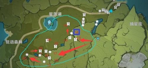 2、在下面的地图上已经标出了全部宝箱的位置,其中也显示了具体的高低落差,其中红色表示要高处爬山,蓝色表示在低处,也就是有的要爬山,有的要去其他比较矮的地方。