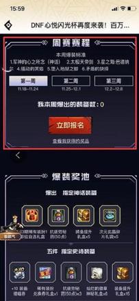 1、首先在官方APPDNF助手里选择闪光杯活动下单到周赛赛程进行报名;爆出赛程装备可以获得大量奖励。