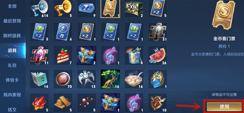 1、首先玩家们进入游戏后,打开自己的仓库背包,然后点击道具,找到如下图所示的金币赛门票,最后点使用。